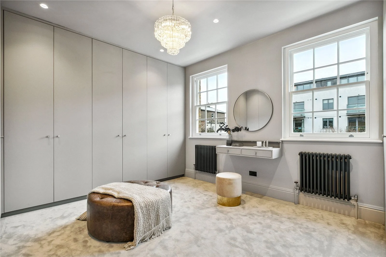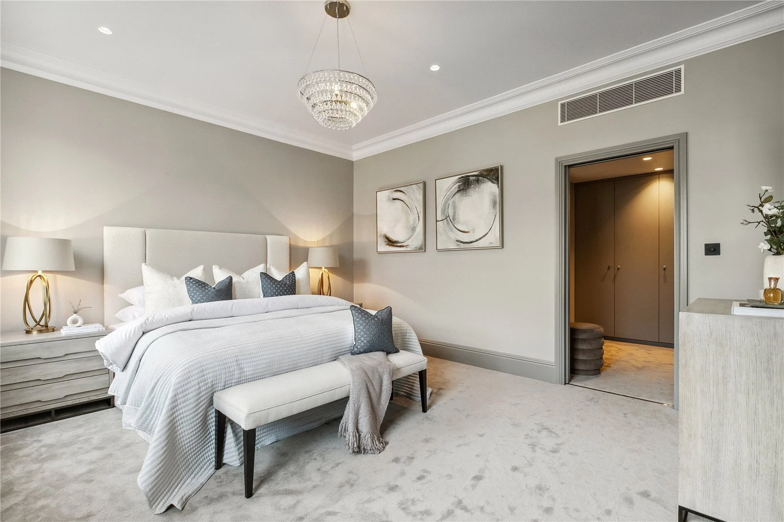 Upstairs on the first floor are two double bedrooms including the expansive principal suite with a luxurious en suite bathroom including a freestanding bath, a double walk-through shower and twin sinks. A sumptuous dressing room off the en suite can also be accessed via a “hidden door” on the landing and has views overlooking the garden. A second suite includes a double bedroom, dressing room with bespoke cabinetry and an en suite shower room. Stairs lead up to the second floor where there are a further three double bedrooms, each with an en suite and built-in wardrobes. A study and extra storage cupboard can also be found on this level.