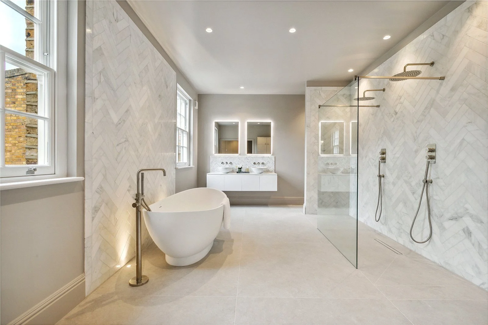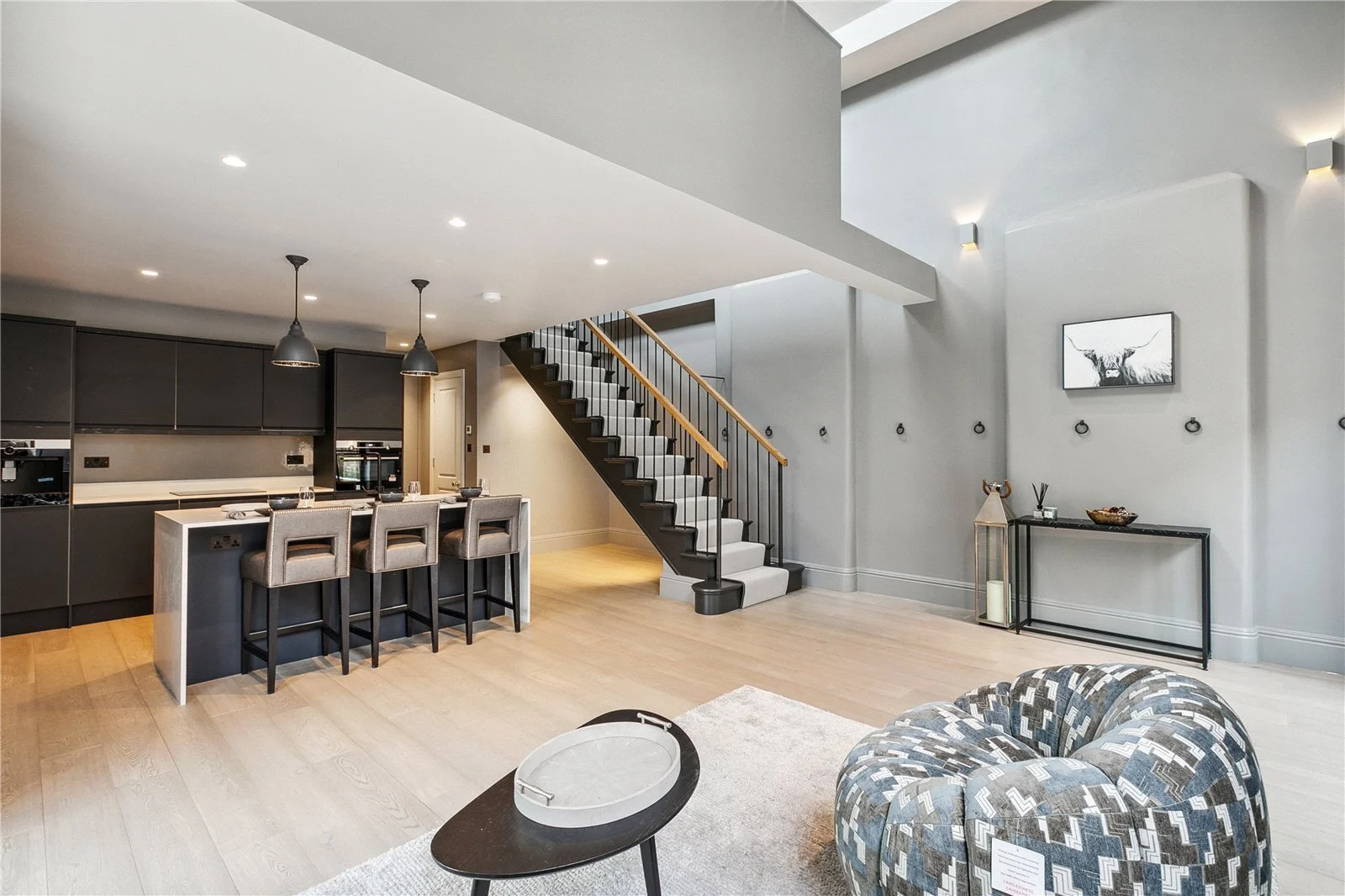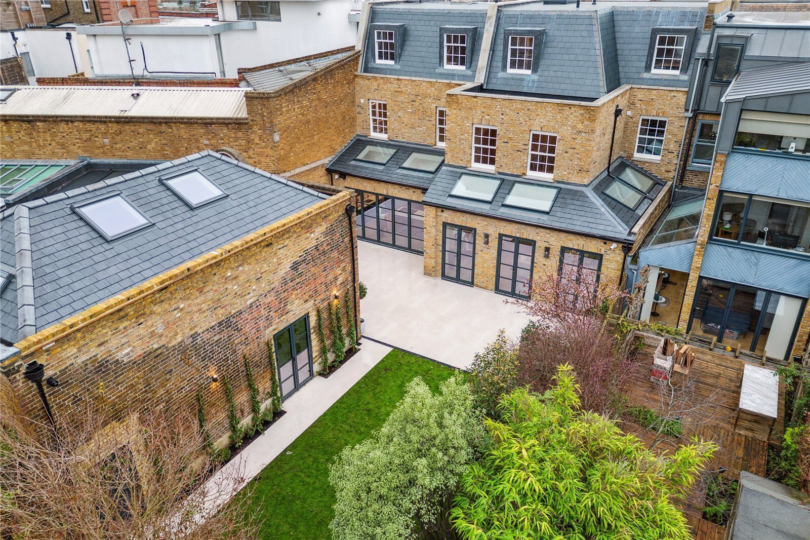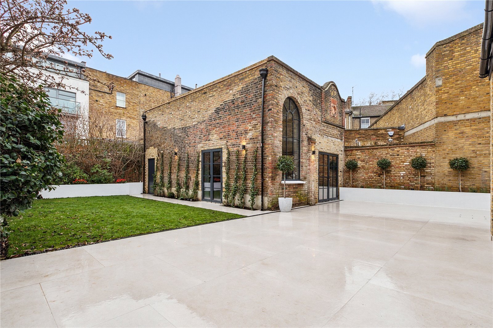 The Olive and Barr kitchen has an excellent range of Shaker-style wall and base units, fully integrated Miele appliances, white marble worksurfaces and a large island with breakfast bar. Sonos speakers and air conditioning run throughout the ground floor. The floor-to-ceiling Crittal bi-fold doors open onto the unique west-facing walled garden and the striking summer house/annexe. Beautifully landscaped and planted, the garden provides a fantastic outside space with a great sense of privacy.