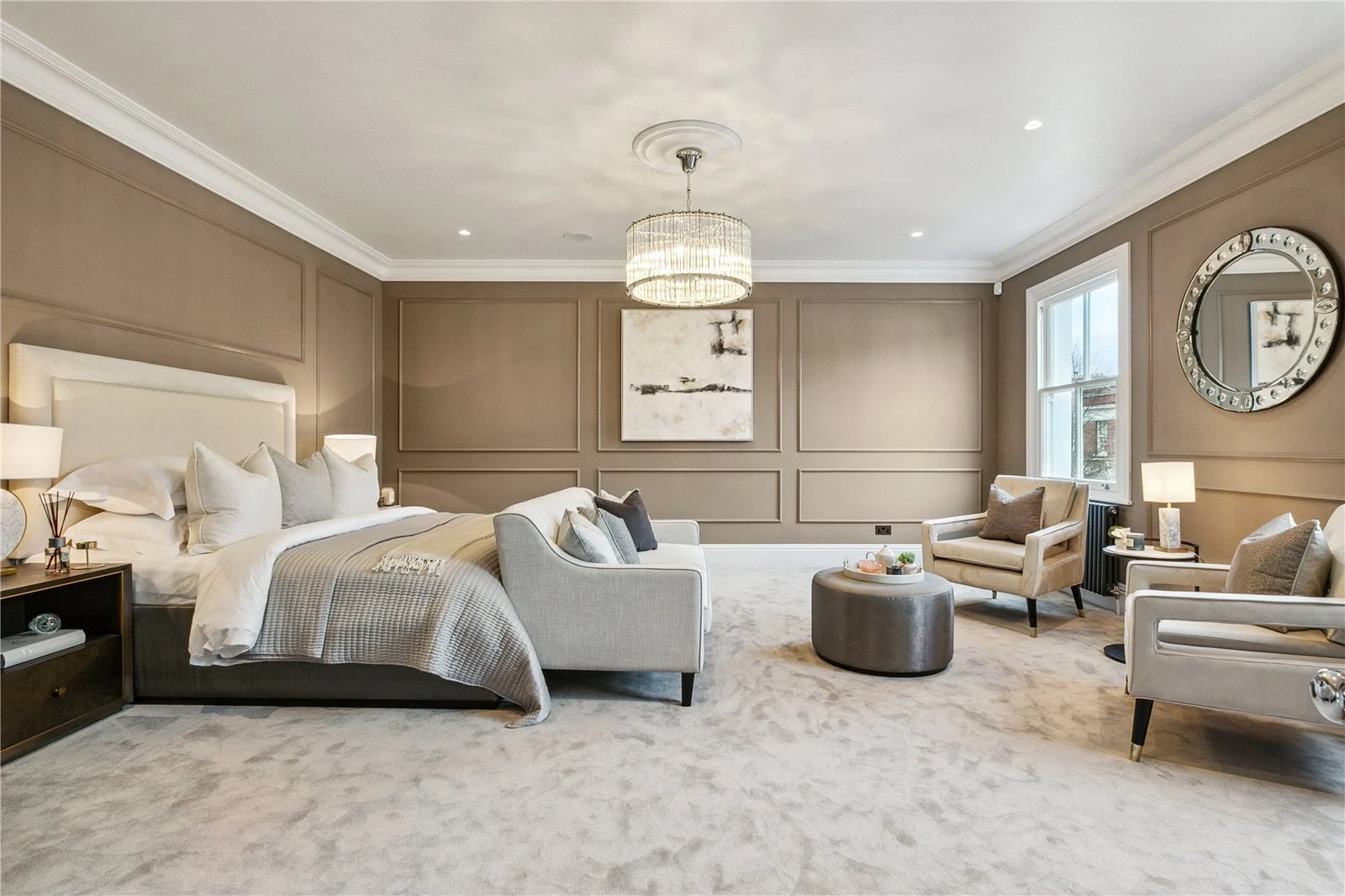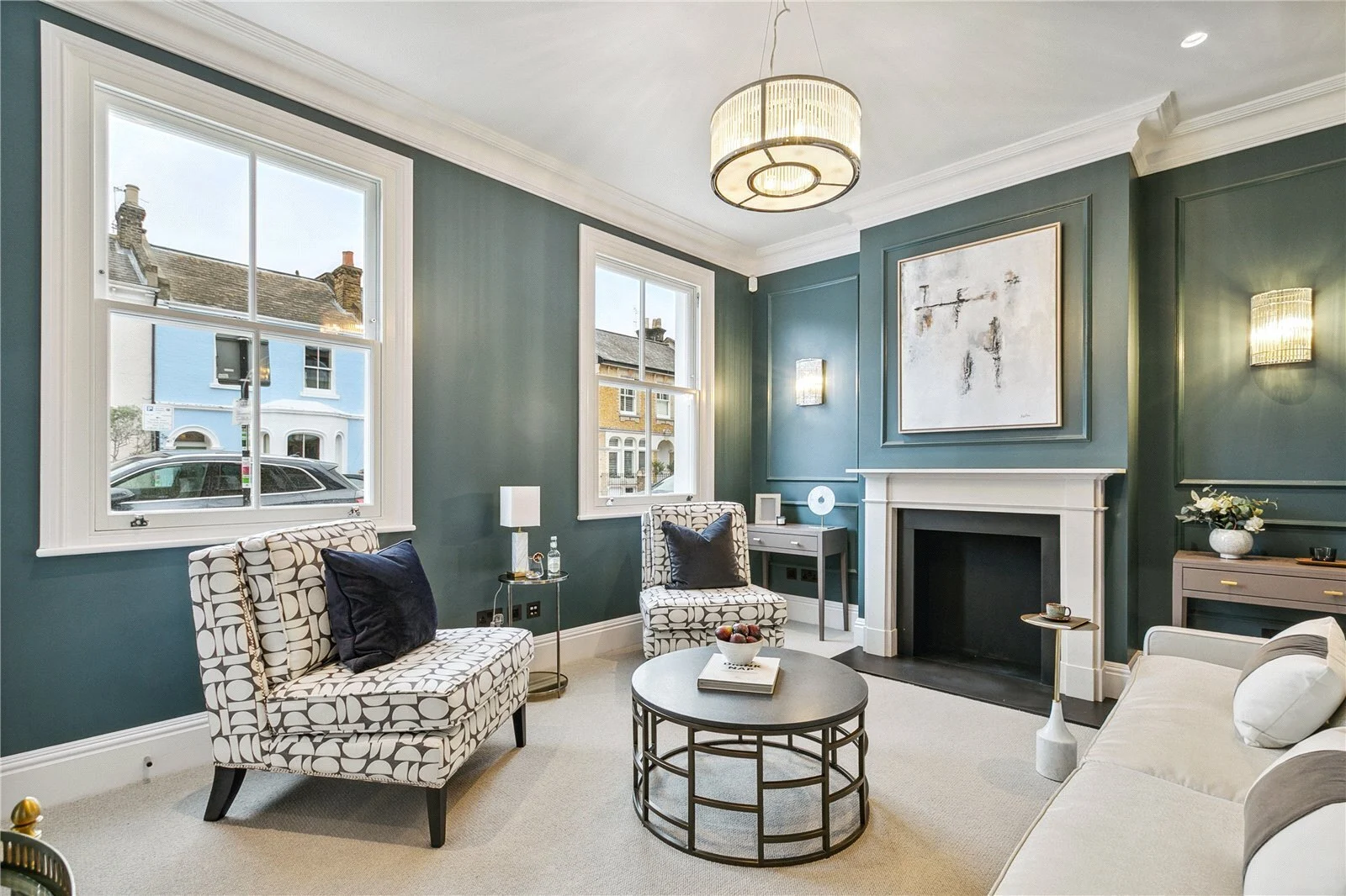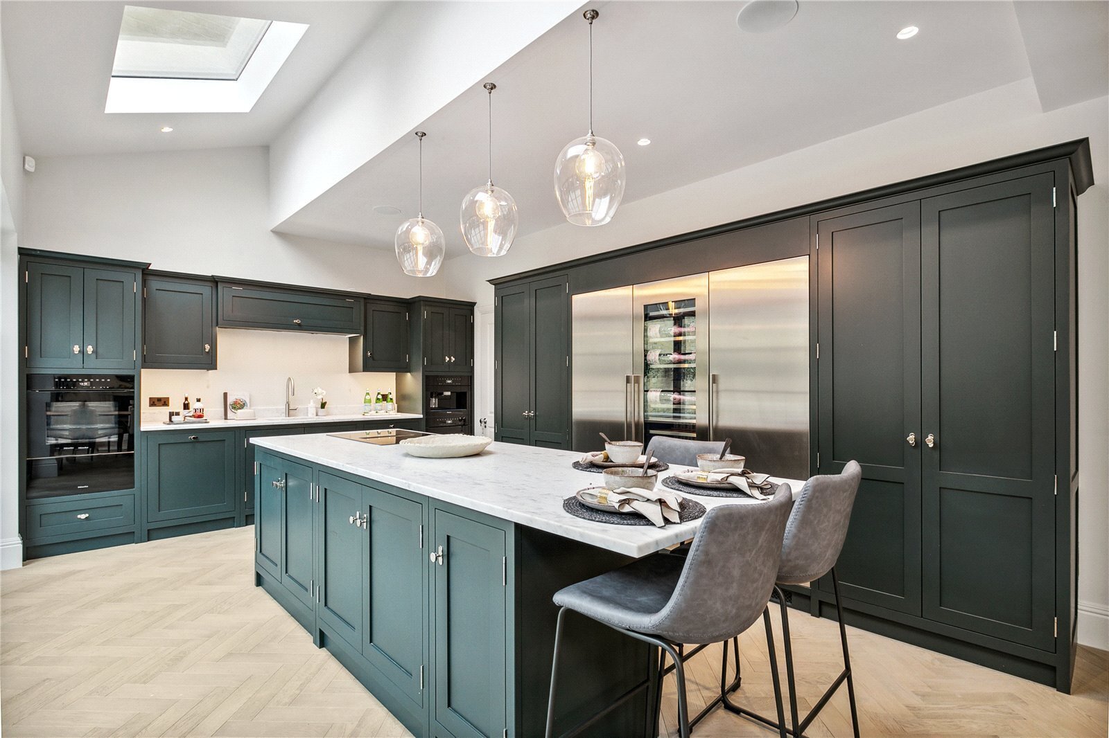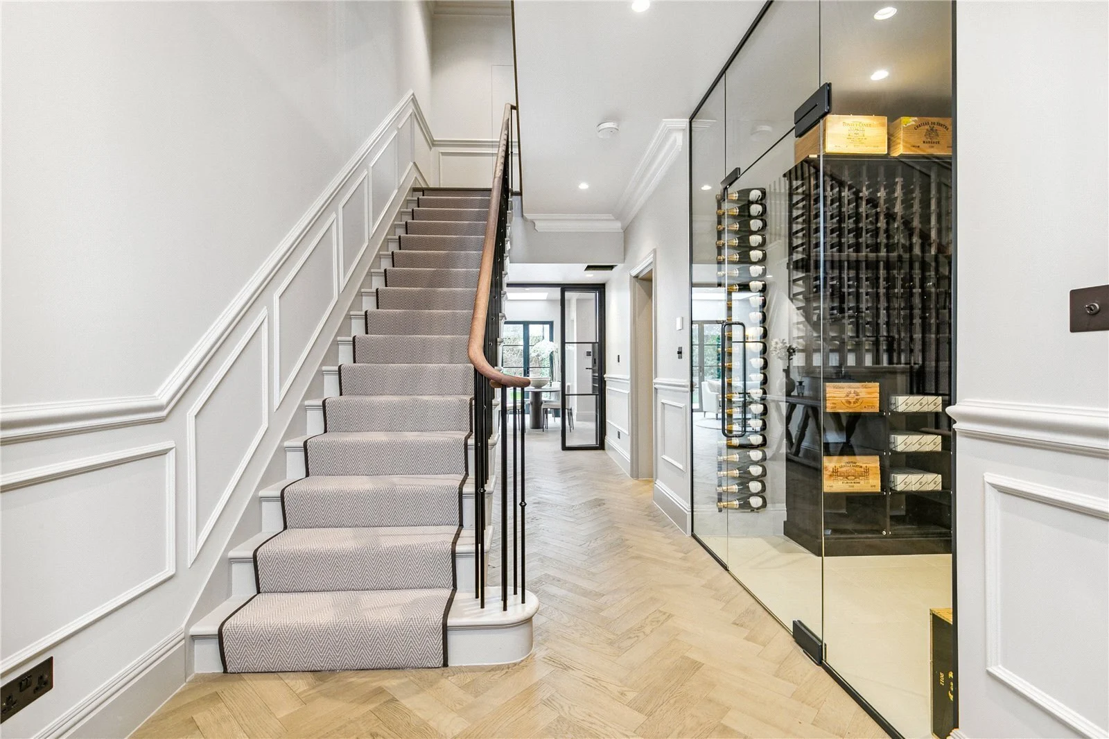 Towards the front of the property is a sophisticated reception room with high ceilings, striking painted wood panelling, and twin sash windows which flood the room with light. Off the entrance hall is a fantastic wine room with a 386-bottle capacity, a utility room. and a downstairs cloakroom. The property includes a large garage with a remote-control electronic door with internal access from the kitchen and an electric car charging point, there is also additional off-street parking.