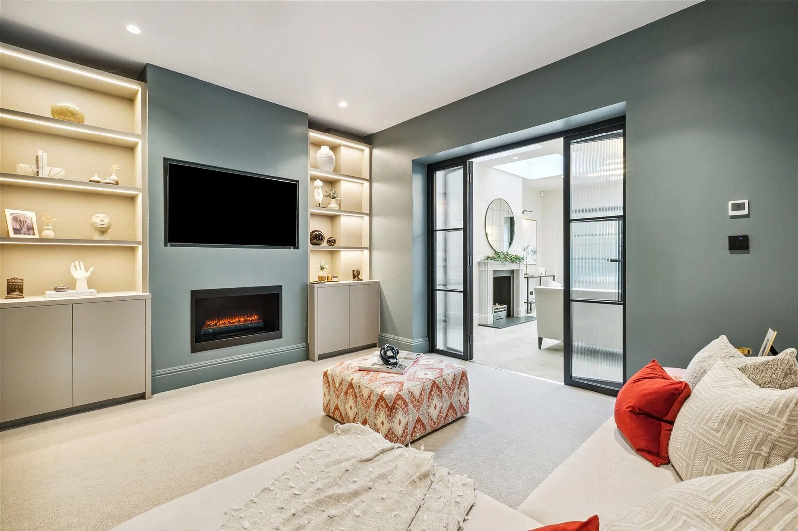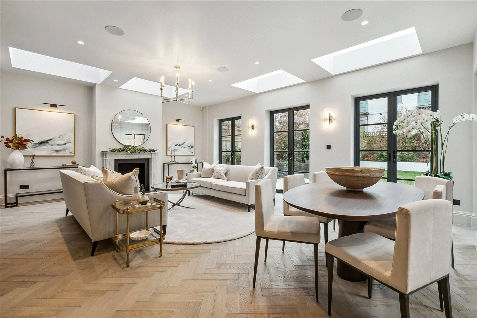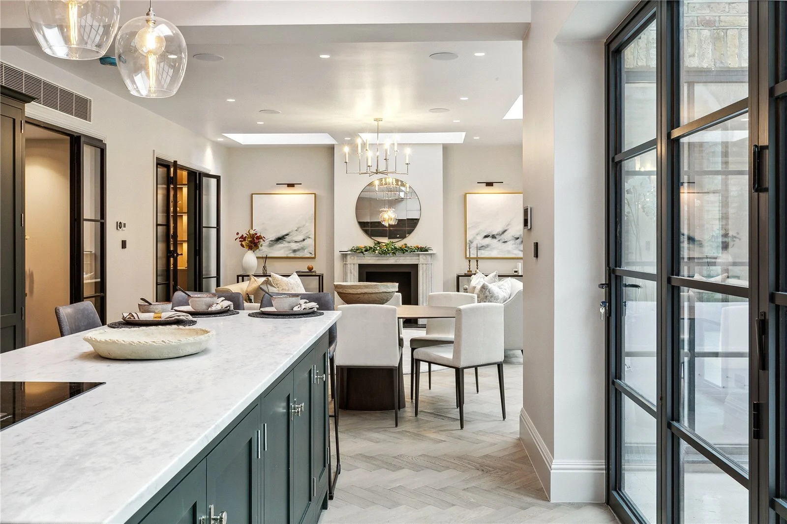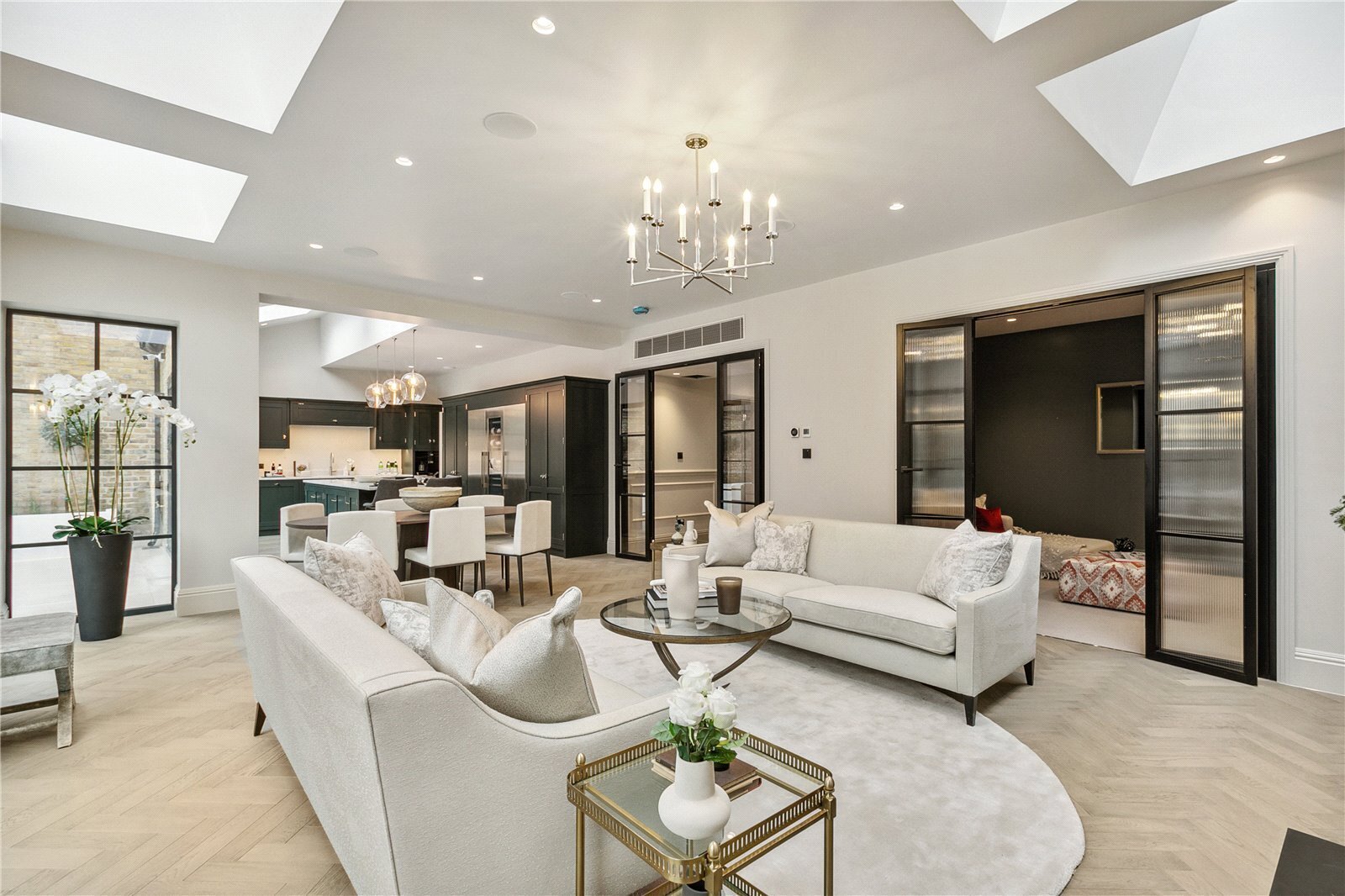 Set back from the road behind elegant railings, the property opens onto a large central hallway laid with stunning parquet flooring leading into the substantial kitchen family room that makes the most of the lateral space of the property, running the full width of over 42 ft. The room is incredibly bright thanks to the abundance of Crittal style doors as well as skylights. The reception area here benefits from an elegant marble bio-ethanol fireplace and three sets of French doors opening to the large entertaining patio space and lawned garden. Behind the seating area, fluted Crittal style glass double doors open onto the television snug room with a second fireplace and built-in bespoke storage and cabinetry either side.